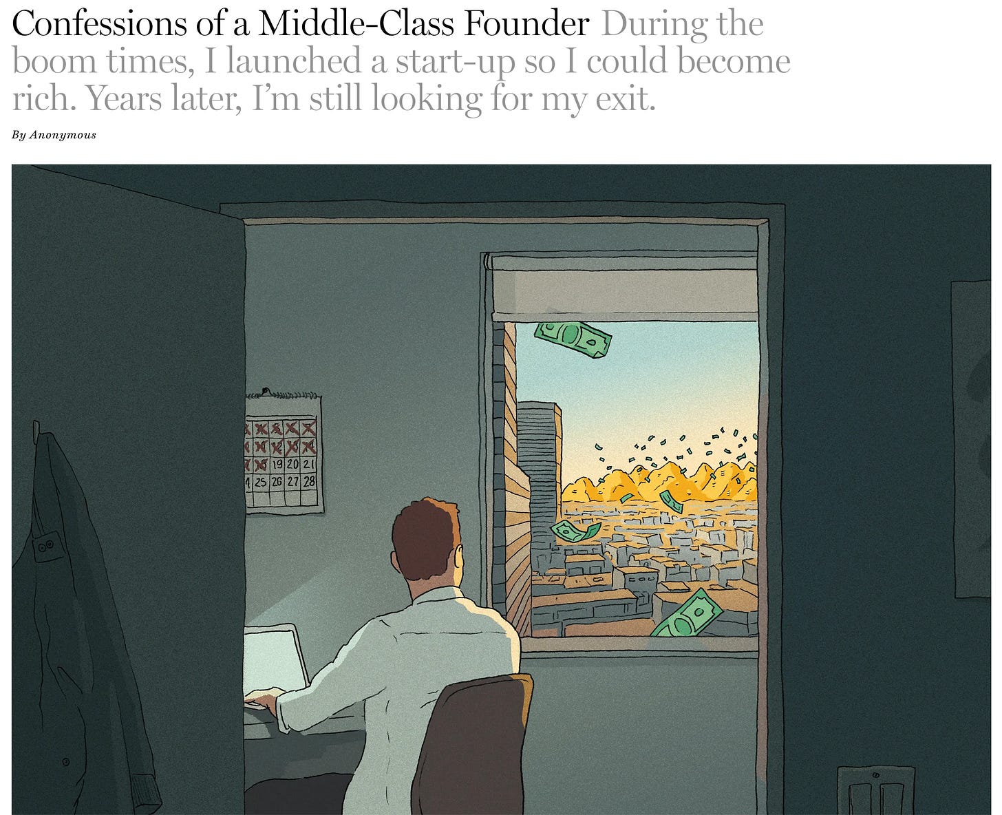 “I could have tried roughing it without venture funding, what the industry calls “bootstrapping.” The venture world has a condescending label for bootstrapped companies without scale potential: a “lifestyle” business, which roughly translates to: Good for you, now back to the sandbox until you’re ready to play with the big boys. Given my professed aim, this could have made sense. But there was so much funding for the taking, and part of me figured that if I was swinging, I may as well swing big. Why not make more than $6 million? So I narrowed my focus to the beam of a management consultant, scanning for hallmarks of a “venture-scale” business: addressable market, gross margins, incumbent NPS, lifetime value. You can Google these terms if you’d like, but taken in aggregate, all they mean is dollar signs.”